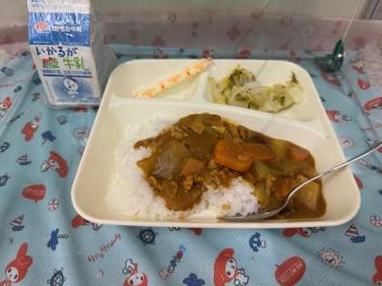 今日の給食は「牛肉と金時豆のカレーライス・はくさいのピクルス・棒チーズ・牛乳」です。
