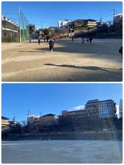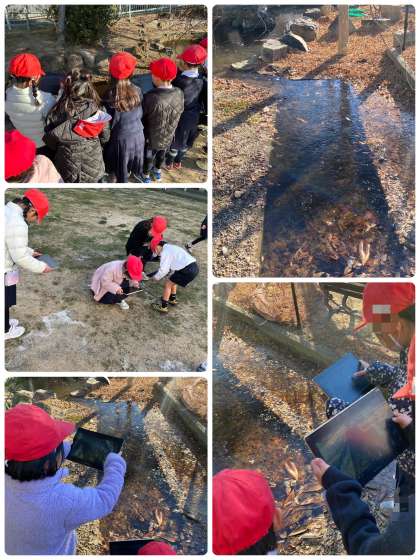 「ふゆをたのしもう」の学習で、運動場や中庭で冬を探しました。中庭の草に小さい氷がたくさんついていたり、運動場の池に氷がはっていたり、手が凍りそうに冷たかったり、冬だと感じることがたくさんありました。秋にたくさん拾った落ち葉も、全部落ちて枝だけになっていました。