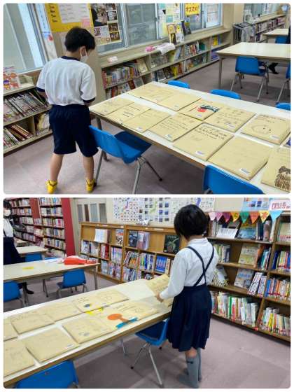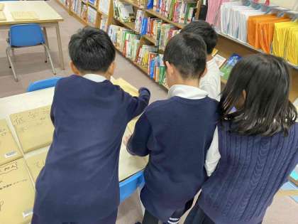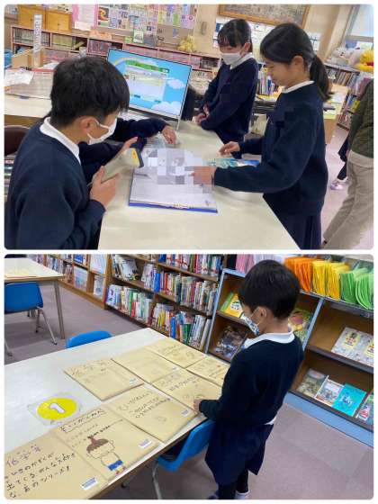 図書委員会の取り組みで、昼休みに本の福袋の貸し出しをしています。低学年、中学年、高学年のブースに分かれて、どのような人におすすめかが封筒に書かれています。みんな楽しみに借りにきています。
