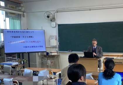 もうすぐ年度末なので、今年度を振り返るために、学級経営の基本的なお話をしていただきました。指導力を高めるために自分たちの人間力を高めることが大切だということや、教師は子どもにとってどんな存在でありたいと思うかなど、初心に戻って考えられた有意義な研修になりました。