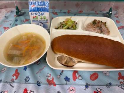 今日の給食は、「豚肉のオイスターソース焼き、中華スープ、ツナとチンゲンサイのいためもの、黒糖パン、牛乳」です。