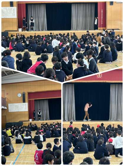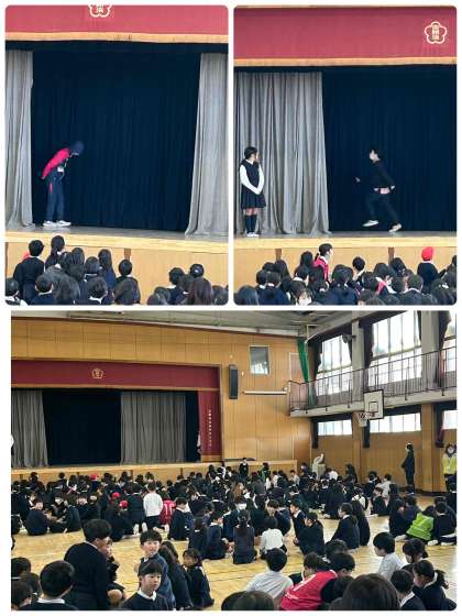 今日の集会は、幕の間を通った先生は誰でしょう?というクイズでした。