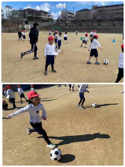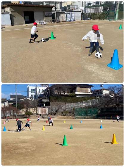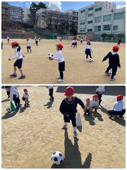 1年生は、元気に体育の学習を頑張っています。ボールをける遊びをしながら、体力づくりです。寒いですが、汗をかいていました。