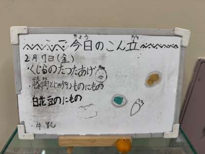 今日の給食は「くじらのたつたあげ・豚肉とじゃがいもの煮もの・白花豆の煮もの・ごはん・牛乳」です。