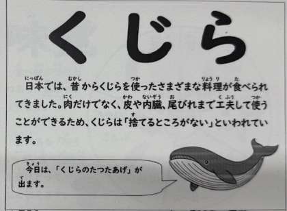 給食では、年に1回くじらを使った献立が登場します。今日はくじらの肉をたつたあげにしています。くじらの赤肉は、たんぱく質を多く含み、不足しやすい鉄も豊富に含まれています。