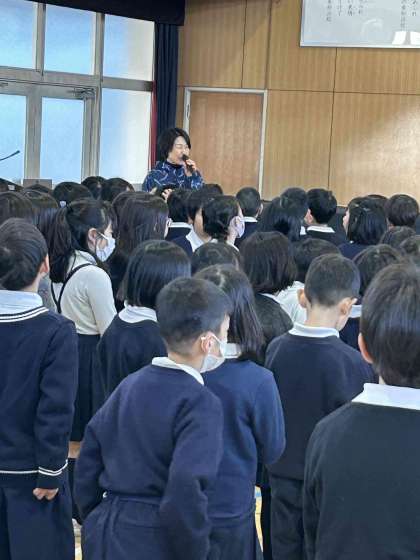 寒い朝ですが、一週間の始まりとして講堂で児童朝会を行いました。