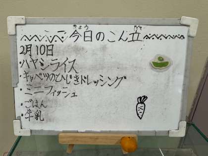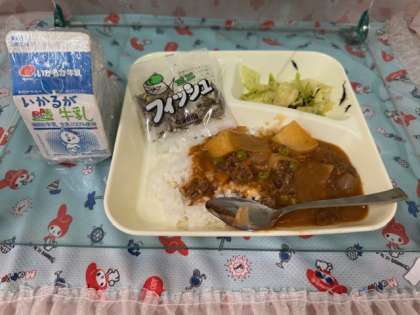 今日の給食は「ハヤシライス・キャベツのひじきドレッシング・ミニフィッシュ・牛乳」です。