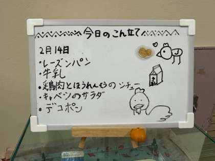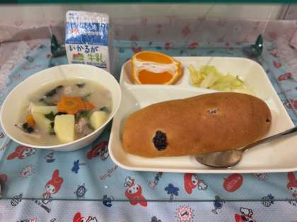 今日の給食は「鶏肉とほうれん草のシチュー・キャベツのサラダ・デコポン・レーズンパン・牛乳」です。