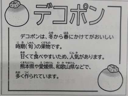 今日は、旬の果物である「デコポン」が登場しました。すっぱいと思っていた低学年児童も、デコポンを口にしてとても喜んでいました。果汁が多く、甘く、そして味もとてもよかったです。