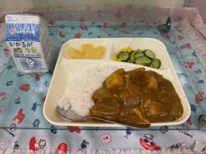 今日の給食は「チキンレバーカレーライス・きゅうりとコーンのサラダ・洋なし(カット缶)・牛乳」です。