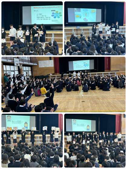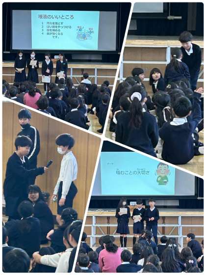 その成果もあり、この前の学校保健委員会で学んだ、よく噛むことの大切さについて、分かりやすく発表できていました。どの学年も、食事の時によく噛むように、合言葉「ひみこのはがいいぜ」を覚えて心がけていきましょう。