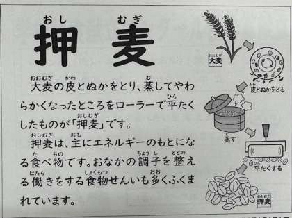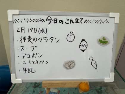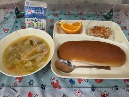 ?今日の給食は「押し麦のグラタン・スープ・デコポン・黒糖パン・牛乳」です。
