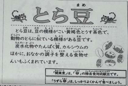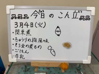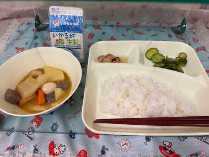今日の給食は「関東煮(うずら卵除去食対応献立)・きゅうりの梅風味・そら豆の煮物・ごはん・牛乳」です。