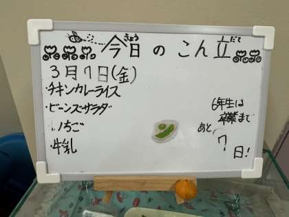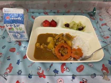 チキンカレーライスには、ラッキーにんじんが入っていました。ラッキーにんじんが入っていた子どもは、大事にラッキーにんじんを置いていて、最後に楽しみとして食べていました。