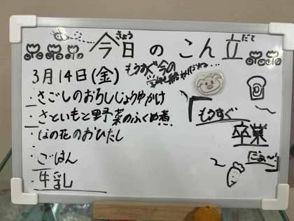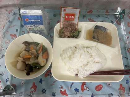 さごしのおろし醤油かけ、里芋と野菜の含め煮、菜の花のおひたし、ご飯、牛乳