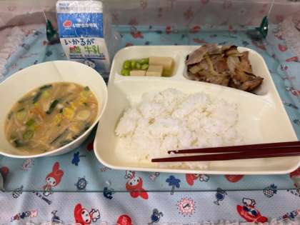 今日の給食は「豚肉のしょうが焼き・みそ汁・高野どうふの煮もの・ごはん・牛乳」です。