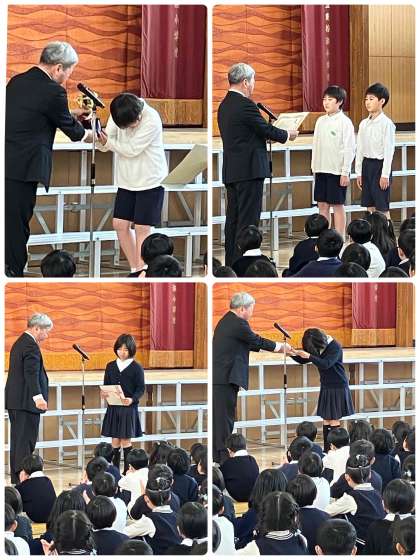 大阪市歌斉唱に続いて校長先生からのお話でした。この1年間の頑張りをほめておられめした。そして、春休みに次の学年での目標をしっかり決めておきましょうとも言われました。続いてガンバーズが優勝したことの表彰がありました。