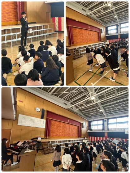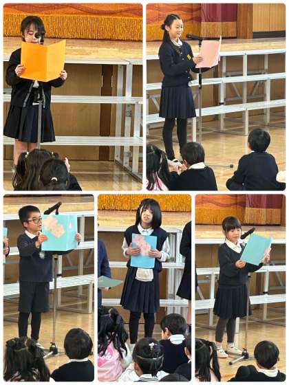 次に1年生と4年生からこの1年の振り返りのまとめの作文を発表していました。とても上手に発表できました。