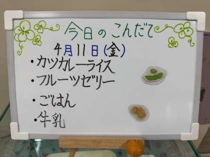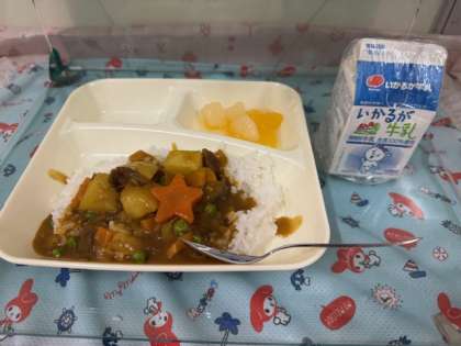 カレーは子ども達にとても好評です。ラッキーニンジンといって星やハートに型抜きされたにんじんも入っています。