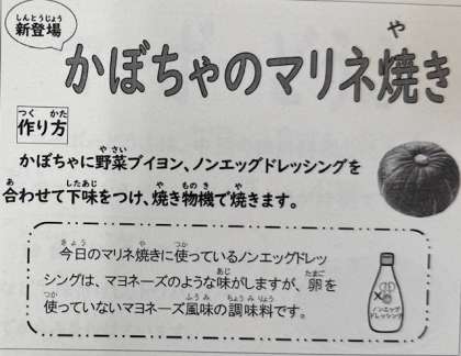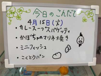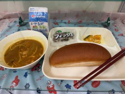 今日の給食は「カレースープスパゲッティ・かぼちゃのマリネ焼き・ミニフィッシュ・黒糖パン・牛乳」です。