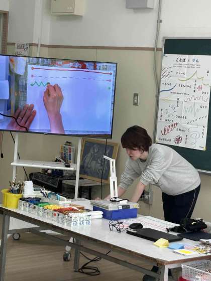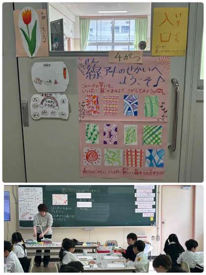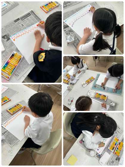1年生の図工は、専科の先生が教えてくださっています。絵画室という特別教室に行って、クレパスを使って色々な線を描く学習をしました。