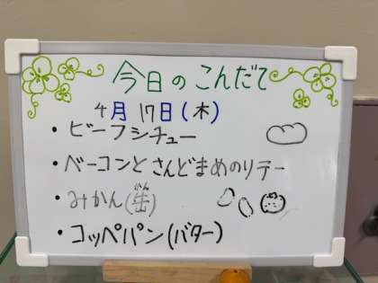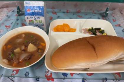 今日の給食は、「ビーフシチュー・ベーコンと三度豆のソテー・みかん(かん)・コッペパン・バター・牛乳」です。