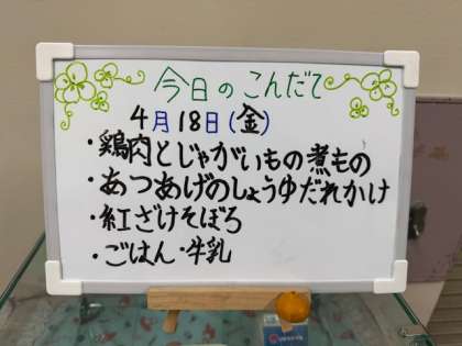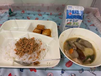 今日の給食は「鶏肉とじゃがいもの煮もの・あつあげのしょうゆだれかけ・紅ざけそぼろ・ごはん・牛乳」です。