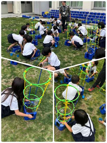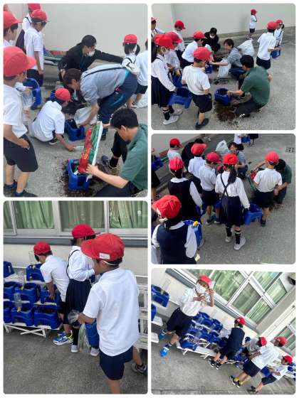 2年生が生活科の学習として、1年生の時に育てたあさがおの鉢を使って、ミニトマトを植えていました。