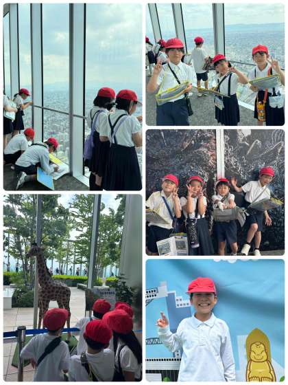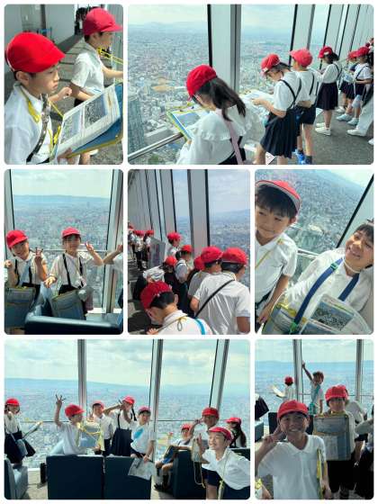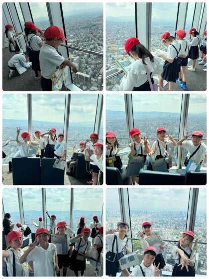 大阪市内の東西南北それぞれの方向に見える主な建物、その方向の特徴などをワークシートに記録しています。東粉浜小学校も見えました。万博会場も見えました。
