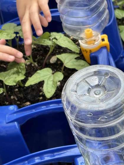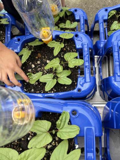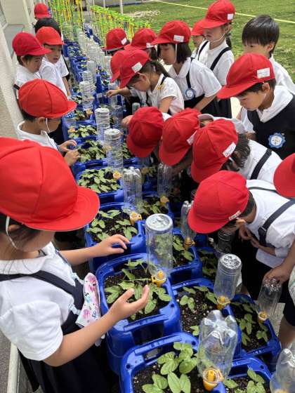 生活科で、少し出始めた本葉の観察をしました。「柔らかい」「さらさらやー」「ふわふわしてるー」など触った感触を表現していました。大きくなるのが楽しみです。