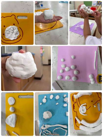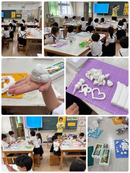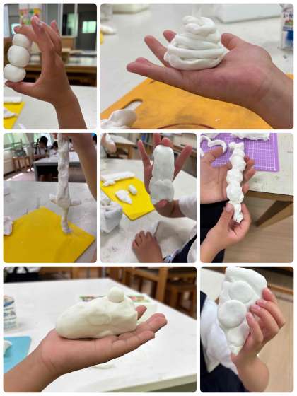 図工で粘土を使った学習をしました。たこ焼きができた!ホットドックみたい。ピザだよ。あめちゃんができた。おにぎりになった。これはお宝だよ。モンブラン、いちごケーキ、ねじねじマシュマロ。ピザ、エビフライ。子ども達の好きな食べ物がどんどん出来てきます。
