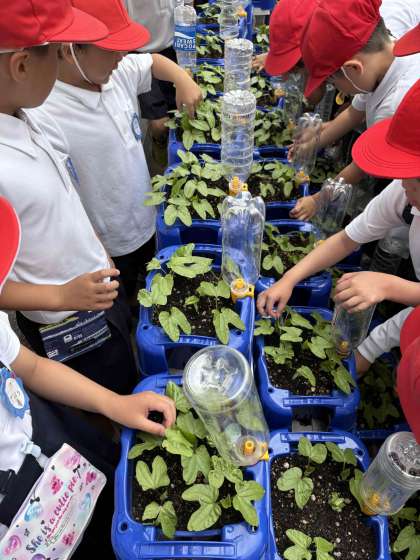 休み時間にお世話をしているあさがおが、物凄く大きくなってる!と教えてくれた子が沢山いました。生活科の時間にみんなで見に行きました。匂いや触った感じ、音がするかな?など、色々と観察をしていました。毎日お世話をして変化をよく観察できています。