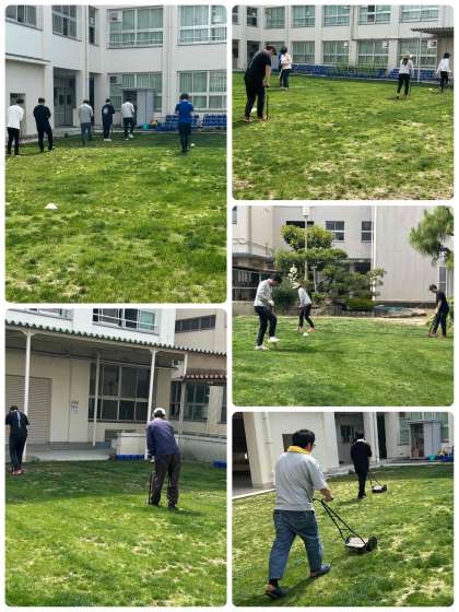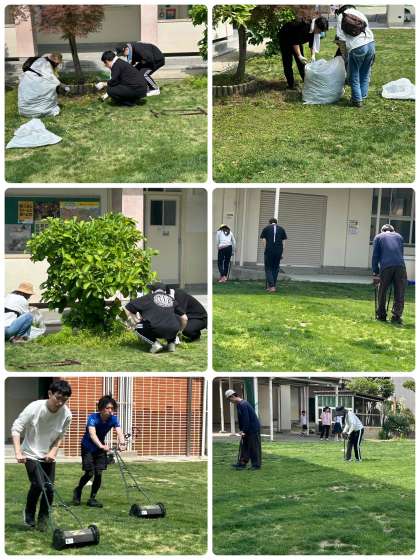 先週土曜日に予定していた春の芝生のメンテナンスですが、雨天でできませんでした。その分、本日朝からPTAの有志や東粉浜幼稚園の方々にもご協力いただき、手入れをしました。