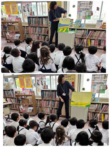 1年生が図書の時間に司書の先生に読み聞かせをしてもらいました。沢山お話を知って、読書が好きになって欲しいです。