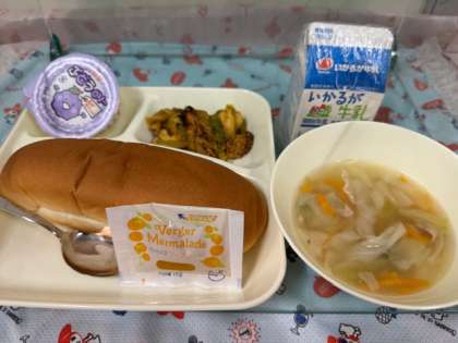 今日の給食は「カレーマカロニグラタン・てぼ豆のスープ・ぶどうゼリー・コッペパン・マーマレードジャム・牛乳」です。