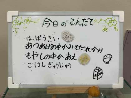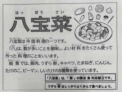 厚揚げが味噌だれとよくあって食欲をそそる一品となっています。またうずらたまごの入った八宝菜は、子どもたちに人気のおかずの一つです。