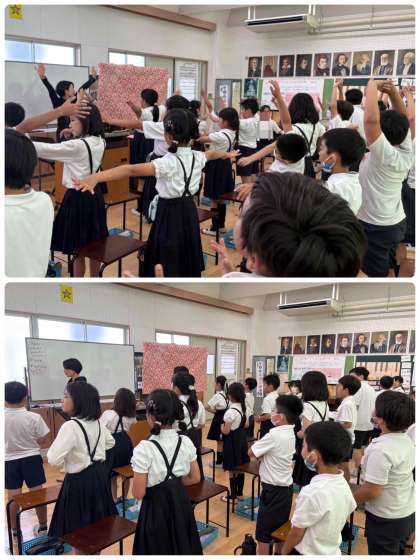 いつものように音楽に合わせてリラックスをしてから、学習に取り組みました。友だちの歌声を聴き合いながら、指揮をしたり、リズムに合わせて体を動かしたりしながら楽しく歌いました。