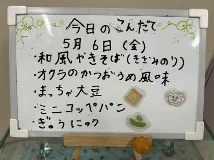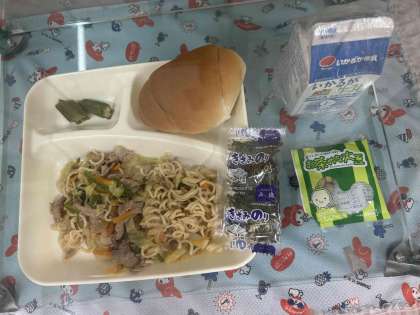 和風焼きそば、きざみのり、オクラのかつお梅風味、抹茶大豆、ミニコッペパン、牛乳