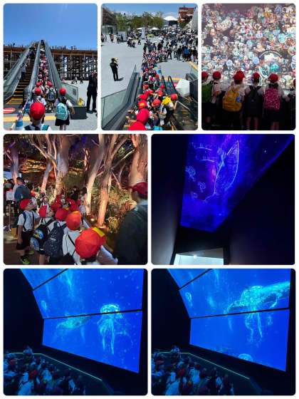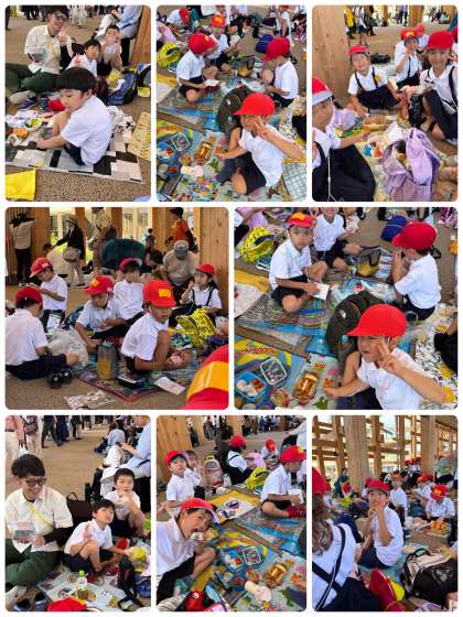 お昼は大屋根リングの下で、各クラスごとにパビリオン見学の合間に食べました。おやつも食べたら,もう少し世界のパビリオンの見学です。