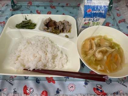 今日の給食は「豚肉の梅風味焼き・さんどまめのごまあえ・五目汁・ごはん・牛乳」です。
