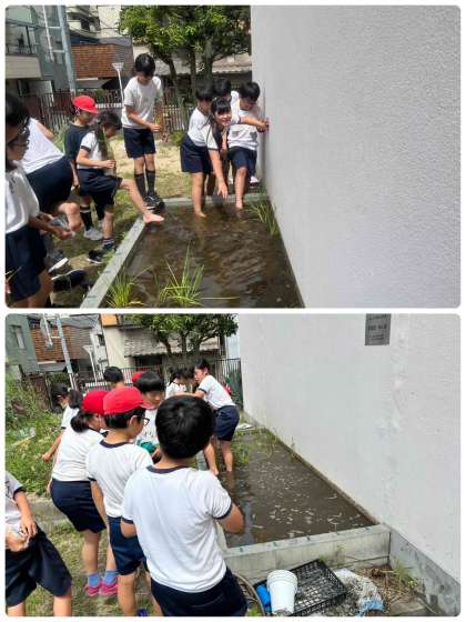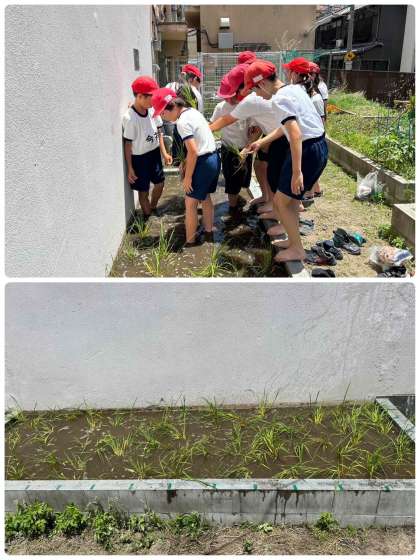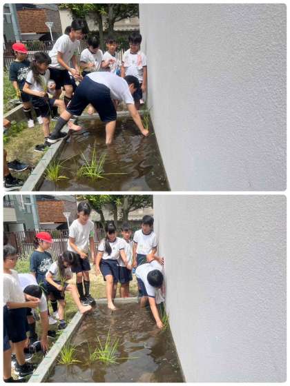 5年生は、田植えをしました。住吉大社の御田と同じ苗を使って、お米ができる様子を観察していきます。大きくなるのが楽しみです。
