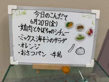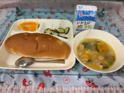 今日の給食は、鶏肉とかぼちゃのシチュー・ミックス海そうのサラダ・オレンジ・おさつパン・牛乳でした。