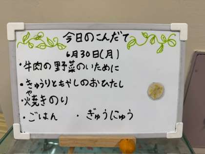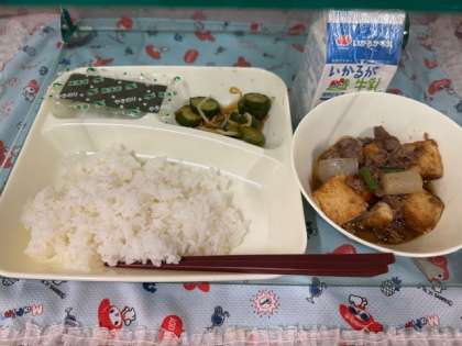 今日の給食は、「牛肉と野菜の炒め煮、きゅうりともやしのおひたし、焼き海苔、ごはん、牛乳」です。