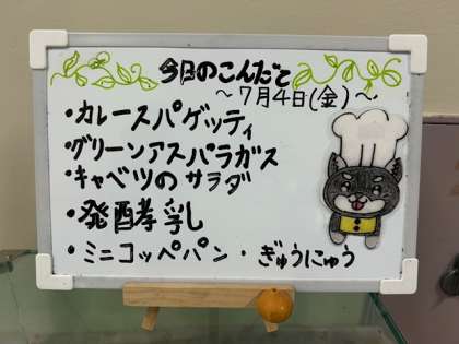 カレースパゲッティは豚ひき肉を主材に、ベーコンで旨味が増しており、カレーのルウで味付けした子ども達に人気の献立でした。発酵乳にも大喜びでした。