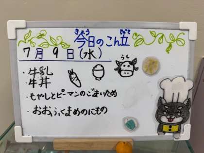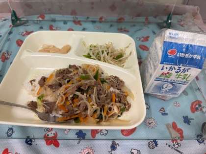 今日の給食は、「牛丼・もやしとピーマンのごまいため・大福豆の煮もの・牛乳」です。