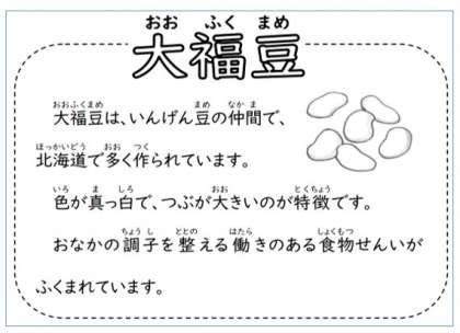 副菜の大福豆は、インゲン豆のなかまです。真っ白な豆です。給食では、釜で30分間熱湯に浸した後、柔らかくなるまで1時間以上煮てから、先に砂糖で味つけして煮こみ、塩、うすくちしょうゆ加えて更に煮て仕上げました。