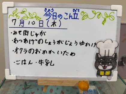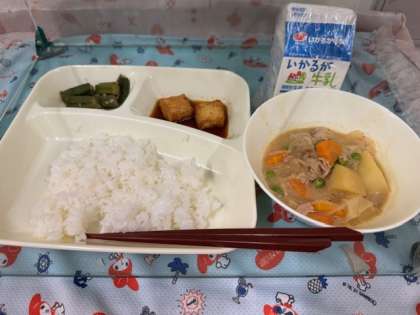 今日の給食は「味噌肉じゃが・厚揚げのしょうがじょうゆがけ・オクラのおかかいため・ご飯・牛乳」です。