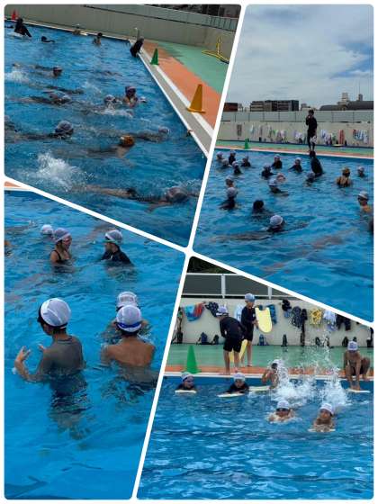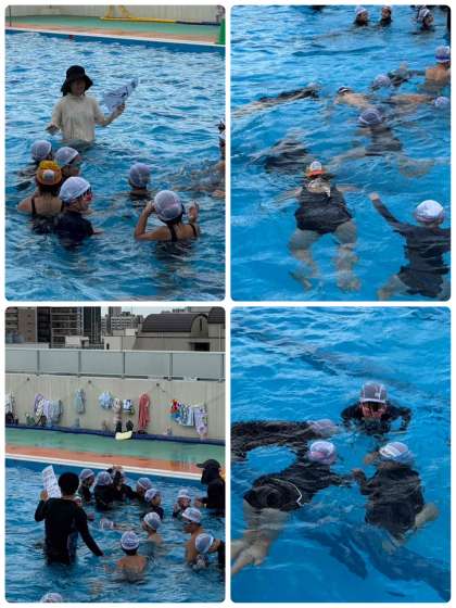 ポニョの曲に合わせて水慣れをしてぶくぶくスタジアム、バタバタdeビート、うきうきアイランドの3カ所に別れて練習をしました。みんなたっぷりと泳げてうれしそうでした。