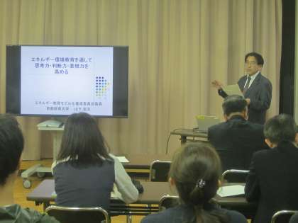 本年度は、エネルギー教育モデル校の2年目になり、研究の充実を図るため、京都教育大学の山下宏文教授をお招きし、校内研修を行いました。エネルギー環境教育を通して子ども達に、主体的かつ適切に判断し行動できる力を育てていきたいと考えております。