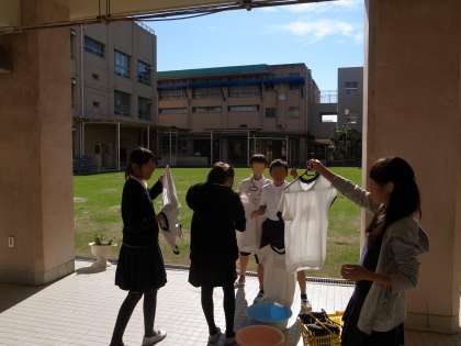 6年生が家庭科で洗濯の実習をしました。桶に洗濯液を入れて体操服を手洗いしました。洗濯機の便利さや昔の人たちの洗濯の大変さを身に染みて感じていました。自分の手で洗った体操服はとてもきれいに洗えていました!
